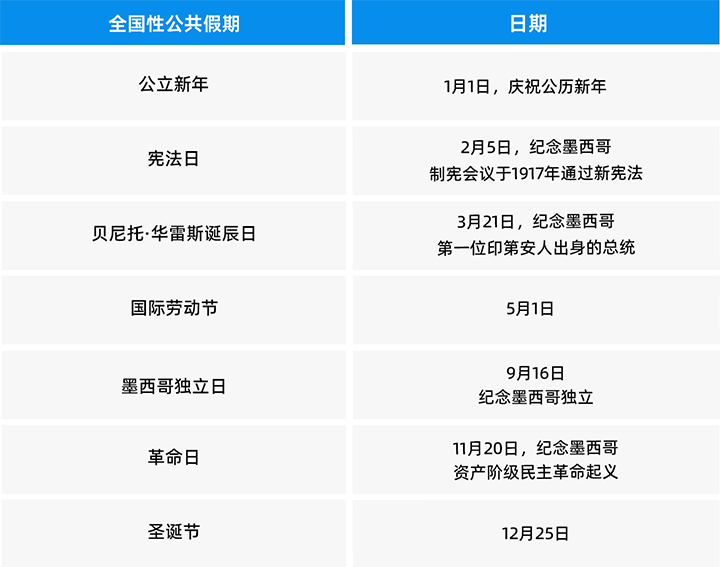 (2) 通常情况下,大部分墨西哥企业遵循8H/天(含午休1小时)的五天工作制。员工在陆续在工作6小时后须至少有30分钟的休息时间。