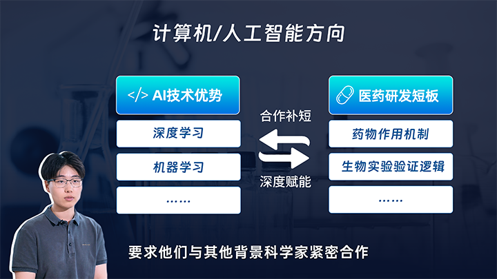 人工智能技术人才精通机器学习、深度学习等在医药研发领域应用广泛的前沿技术,这为他们跨界进入医药研发领域给予了坚实的技术底座。然而,医药研发领域专业门槛高企,传统人工智能技术人才往往对药物作用机制理解不足、也不熟悉生物实验验证逻辑。为弥合这些短板,这类人才需要与具备医学专业背景的科学家紧密合作,优势互补,才能共同开启AIDD领域的大门。